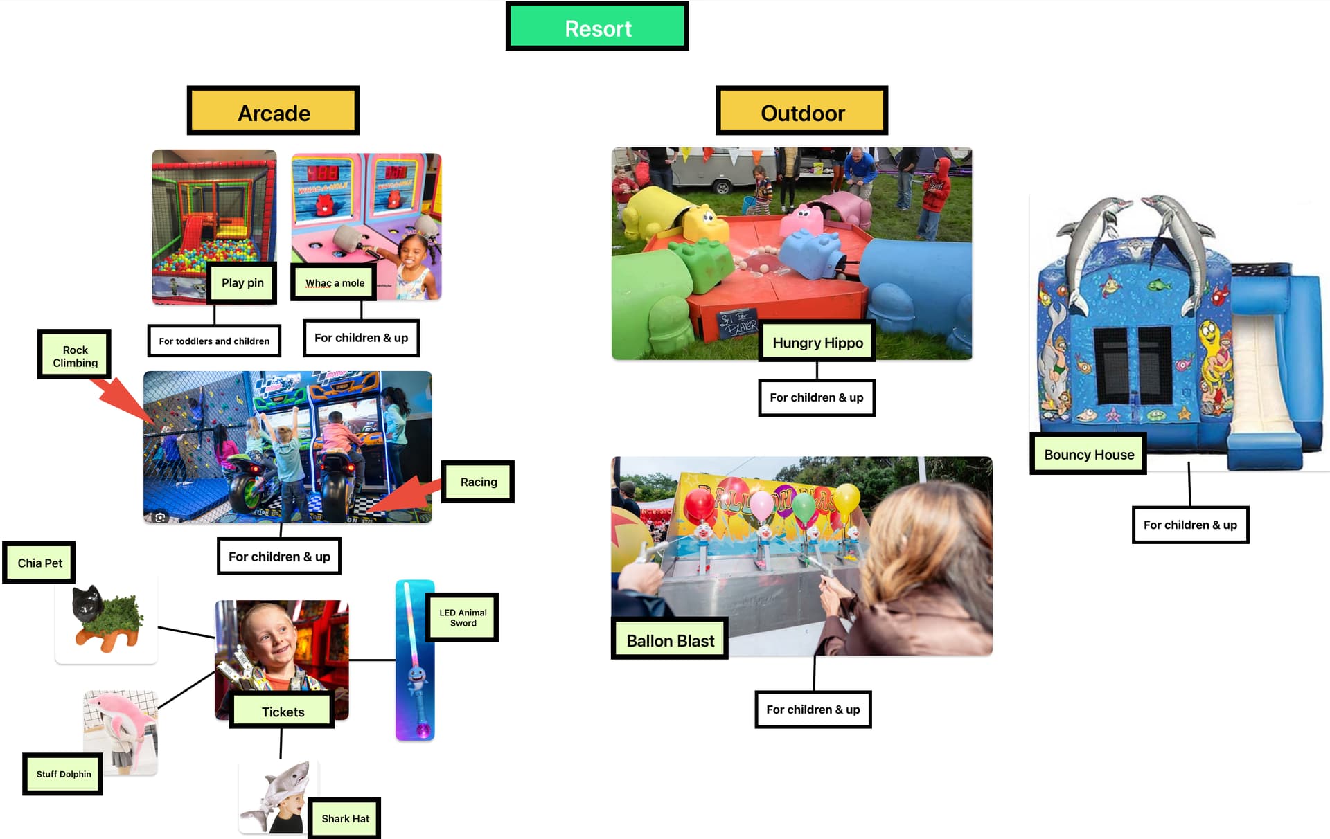 : Currently, children are not able to buy resort coins, go bowling or participate in turtle races. So it would be nice to see more activities such as arcade games they can participate in to win tickets and be able to exchange those tickets for prizes that are exclusively from Cahaya. As for an outdoor activity like the turtle race, maybe incorporating a bouncy house, a physical game similar to “hungry hippo” or a water gun racing game to pop their ballon first can be incorporated so that children, teens and adults can all enjoy. Lastly, there is nothing a toddler can do at the arcade, so maybe adding a small play pit area for them will give them an activity to do if a family outing is taking place.