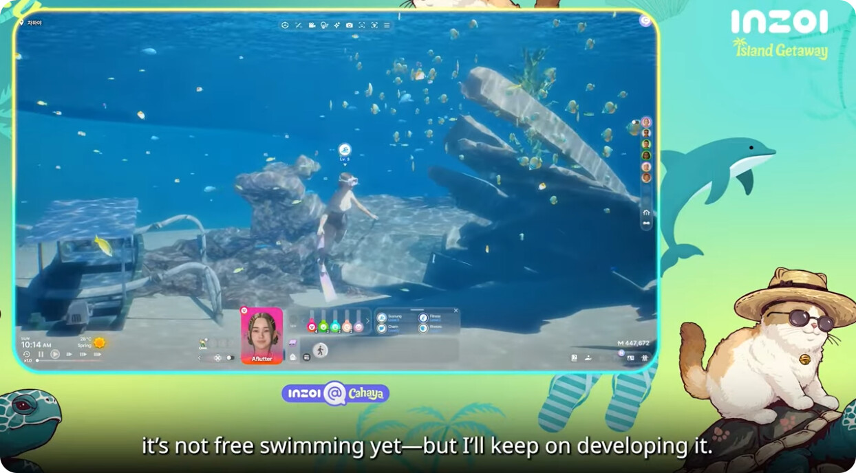 The game now features scuba diving. Before I tried this mechanic, I imagined I would be able to explore the ocean floor, study fish for a collection, and actually swim freely. At the moment, however, the seabed is empty.
